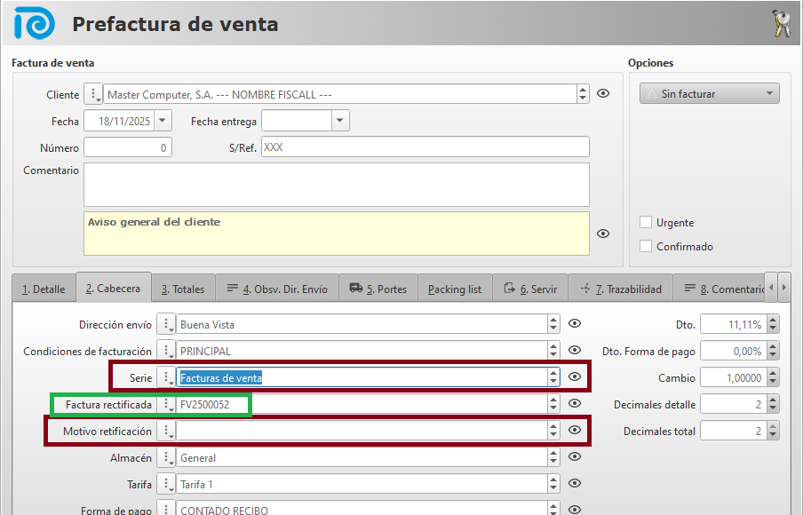 Lo que hay que hacer es seleccionar la serie para las facturas rectificativas y el motivo rectificación. La factura rectificada se rellena de forma automática y en ningún caso hay que indicar el número de factura.