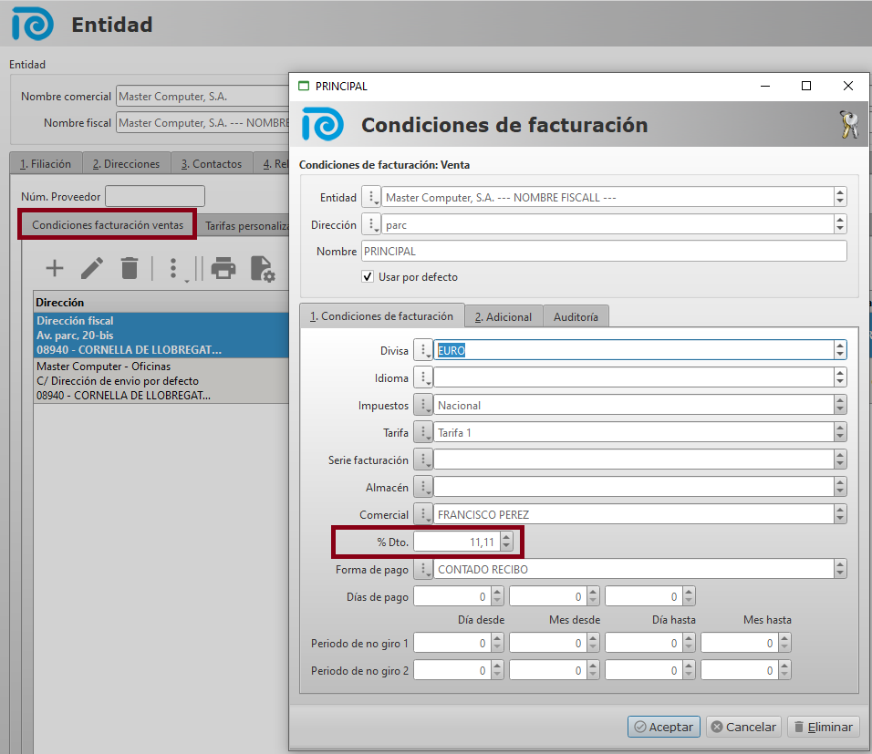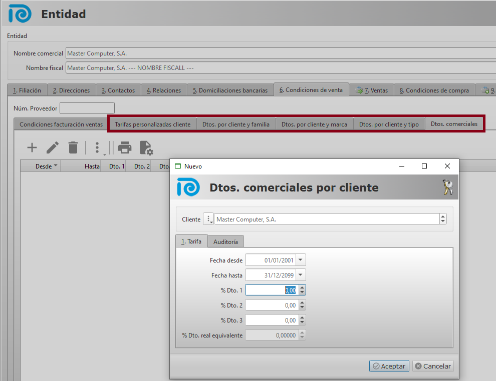 En la misma ficha de cliente se pueden ver las tarifas personalizadas y los diferentes tipos de descuento comerciales por cliente.