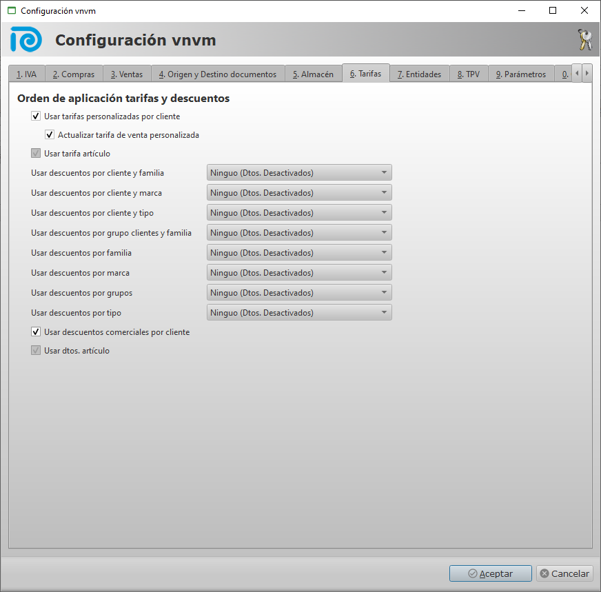 IMPORTANTE: El introducir Dtos. o tarifas personalizadas no hará que se apliquen. Para que el tipo de descuento se aplique debe configurarse en Config. de la aplicación –> Tarifas