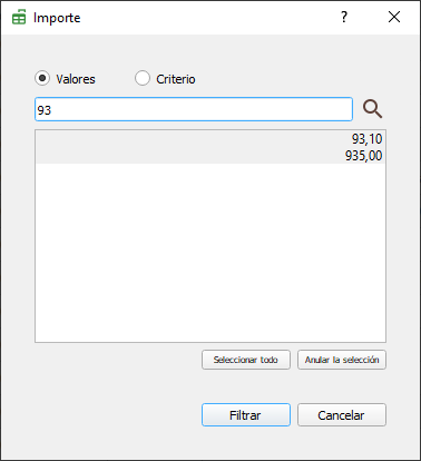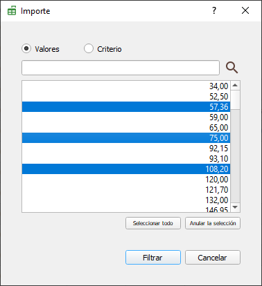 Se mostrará una ventana con los importes donde podremos seleccionar los importes a filtrar o introducir el importe que estemos buscando.