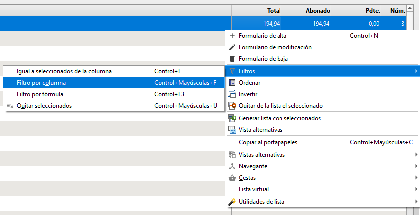 Seleccionamos el filtro por columna, ya sea con la combinación de teclas Crtl+May+F o con el menú de contexto de la rejilla.