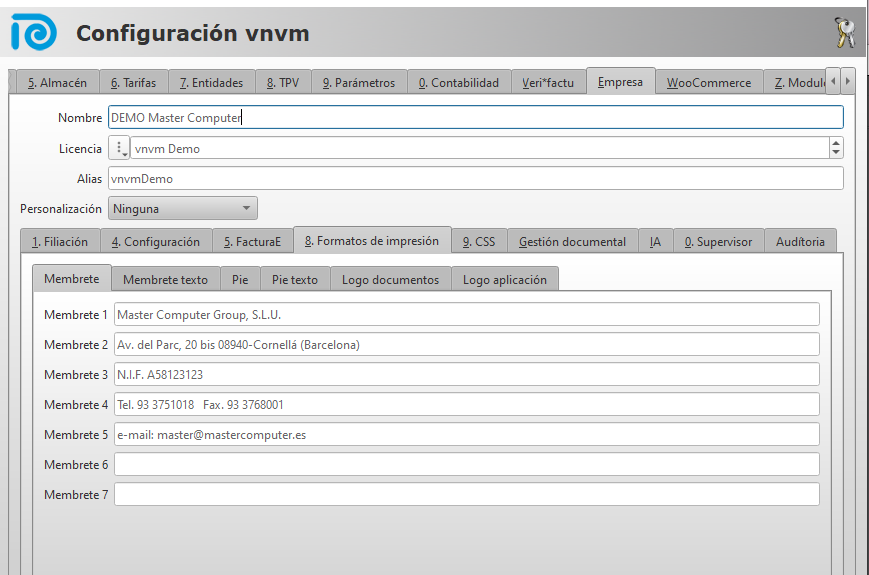 Podemos cambiar los datos del membrete que se imprimen en los documentos en: