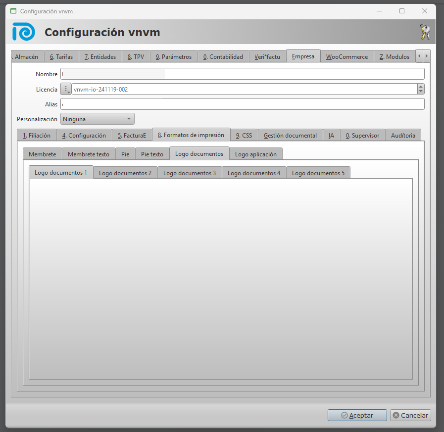 En la pestaña logo documentos podemos incluir el logo que se imprime a la izquierda del membrete.