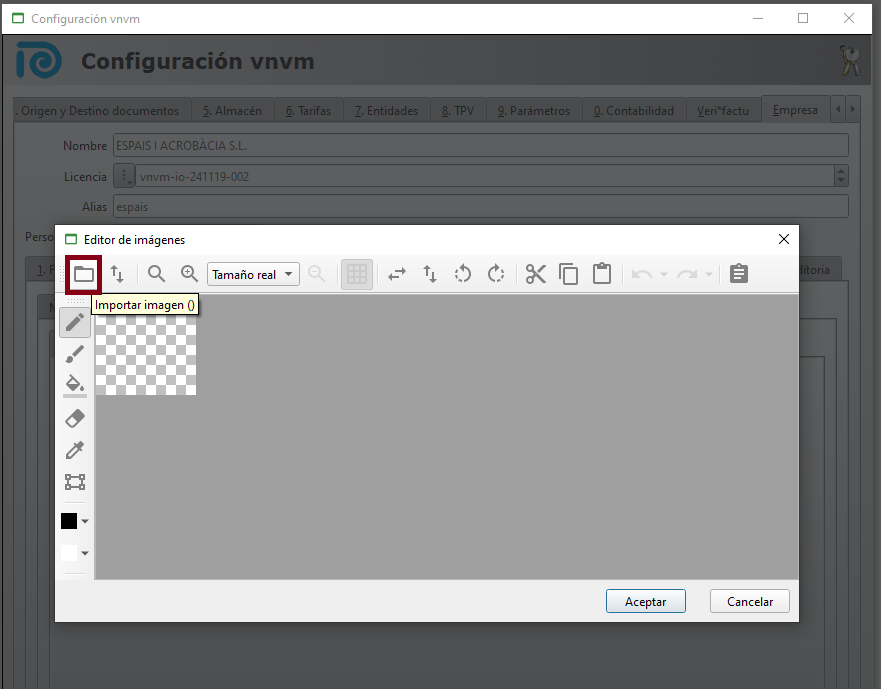 Hacemos doble clic en medio de la pestaña Logo documento 1, se abrirá un editor de imágenes y con el icono de la carpeta se puede importar una imagen